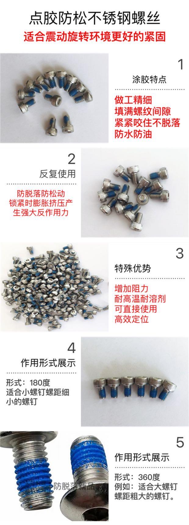 一种特殊的工程树脂,涂在防脱落螺钉上。它有着很高的化学稳定性,耐酸,碱和其他溶剂的优点,并且不会氧化和腐蚀金属,因此螺钉不会生锈,不生锈。涂层的剥离现象有助于满足轻质产品的要求。nailuo厌氧胶加工服务可以根据客户的不同要求为客户化解各种screw螺丝防松疑问。耐落胶是一种特殊技术,可使特殊的工程树脂***黏附在螺纹齿上。运用工程树脂材料的弹性,可以对螺栓和螺母展开挤压,以在锁定过程中取得抗振动和冲击的能力,从而全然化解了由于螺钉松动而引起的运转,发射,飞散和泄漏现象。加工过的螺丝已普遍用于电脑,手机,镜子,家具,脚踏车,溜冰鞋,电子,机器,汽车,摩托车,电动工具,气动工具,手提箱,运动器具,玩具,办公装置,厨房和浴池,洗衣机等,以及关乎防松,密封等所有其他领域,可以基于不同的螺钉标准,材料,扭矩和样品螺钉。